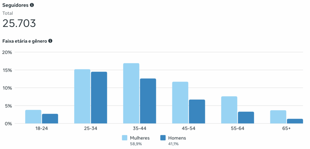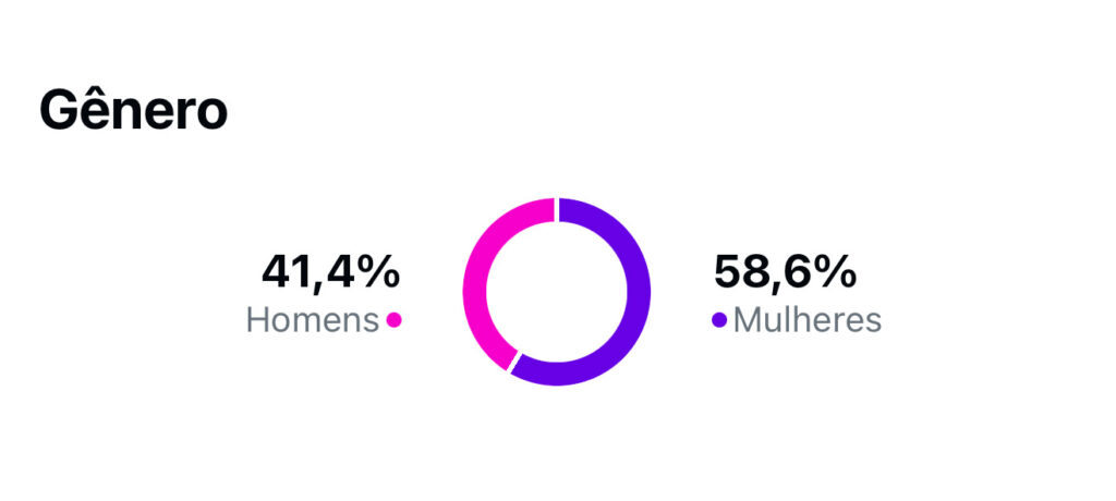 Hoje, são 25.700 seguidores, com crescimento constante e qualificado. A audiência é formada, em sua maioria, por mulheres (58,6%), com idade entre 25 e 44 anos — uma faixa que concentra poder de decisão, interesse em experiências de valor e alta disposição para consumo.