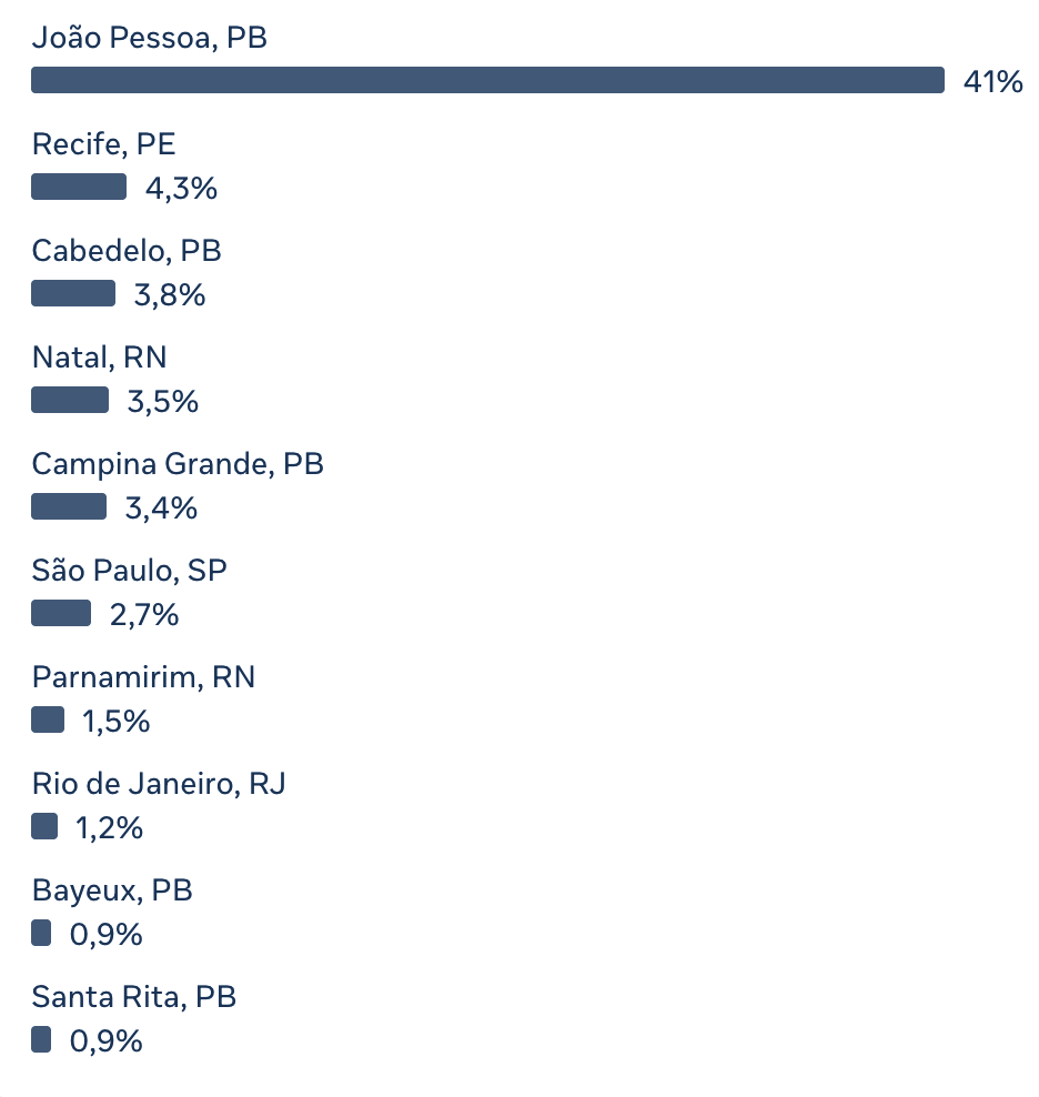 A cidade de João Pessoa lidera com folga como principal localização dos seguidores, seguida por Recife, Natal, Cabedelo e Campina Grande — confirmando minha conexão com a região e o alcance real do que compartilho.