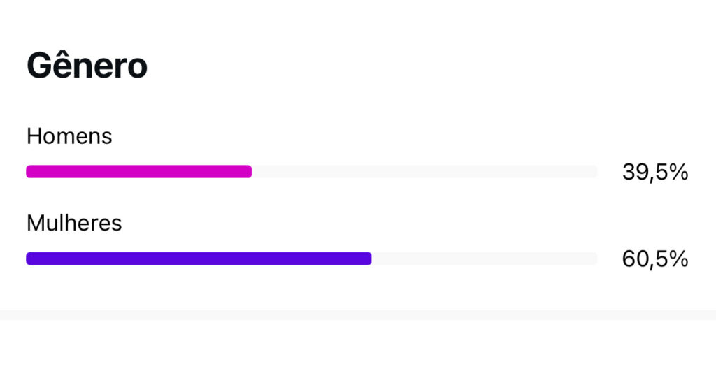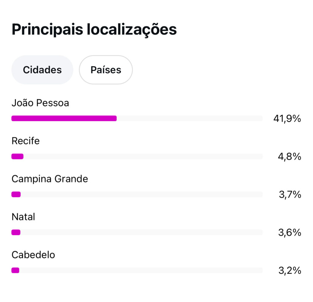 Geograficamente, João Pessoa lidera com 41,9% do público, seguida por Recife (4,8%), Campina Grande (3,7%), Natal (3,6%) e Cabedelo (3,2%), reforçando a forte conexão regional do perfil e sua relevância no Nordeste.